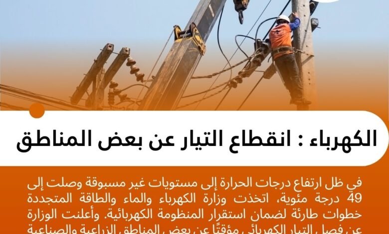 قطع جزئي عن بعض المناطق : في ظل الارتفاع الشديد في درجات الحرارة، وصلت الأحمال الكهربائية في البلاد إلى مستويات غير مسبوقة، مما دفع وزارة الكهرباء والماء والطاقة المتجددة إلى اتخاذ إجراءات احترازية للحفاظ على استقرار المنظومة الكهربائية، بما في ذلك إجراء قطع جزئي عن مناطق معينة.